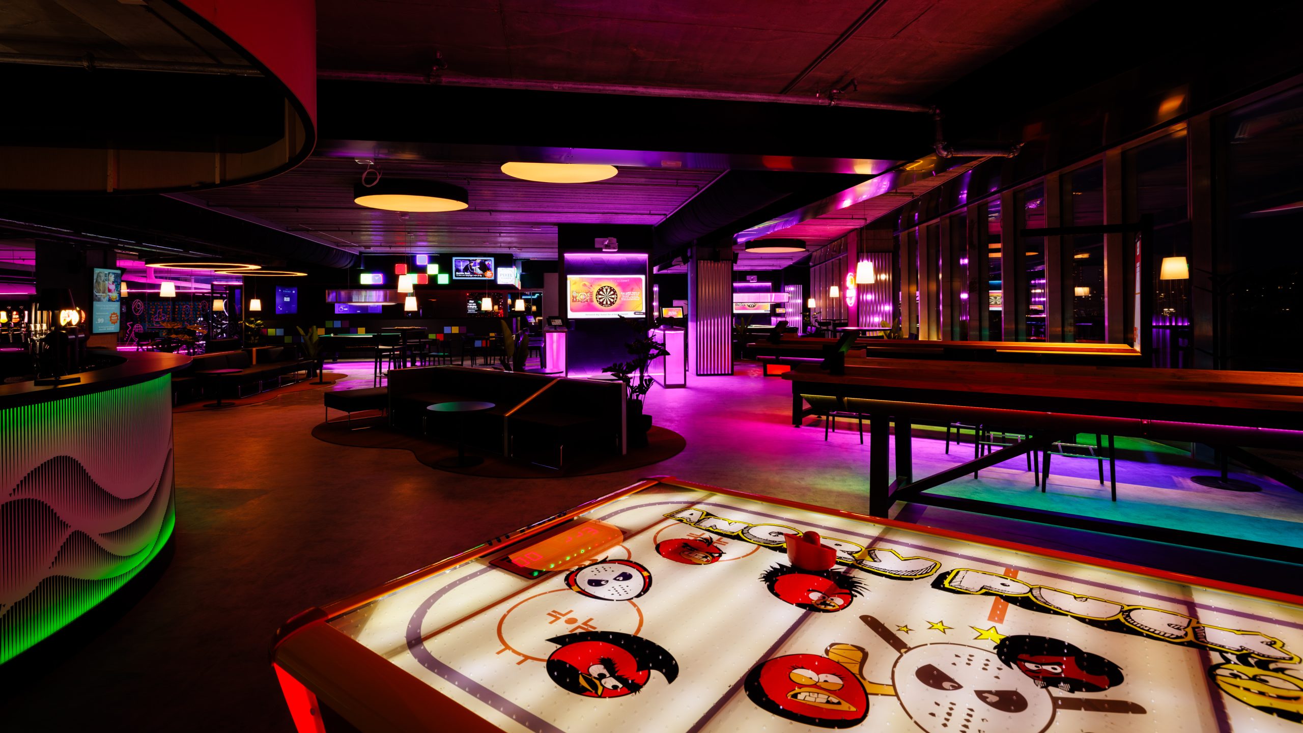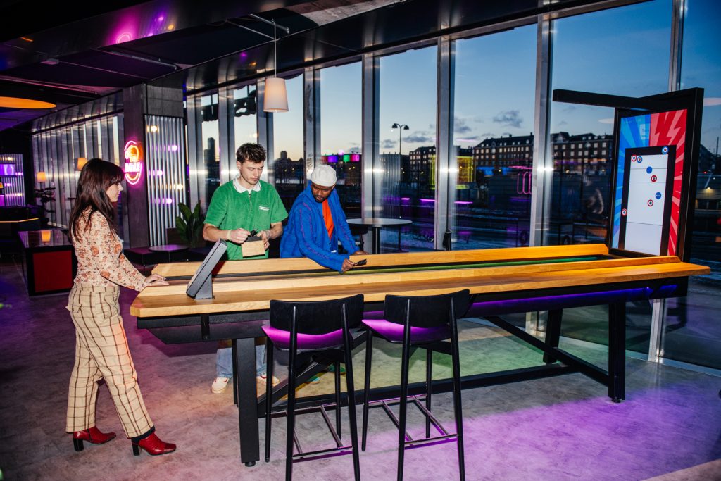Prøv vores interaktive dartspil, hvor skiverne reagerer på dine skud. Prøv jeres kræfter af med air hockey, shuffleboard, beerpong eller pool i en festlig atmosfære. Kast bolden i modstandernes kopper eller glid pucken i mål. Skub shuffleboard-skiverne med præcision for at score point, eller vis dine dart færdigheder.